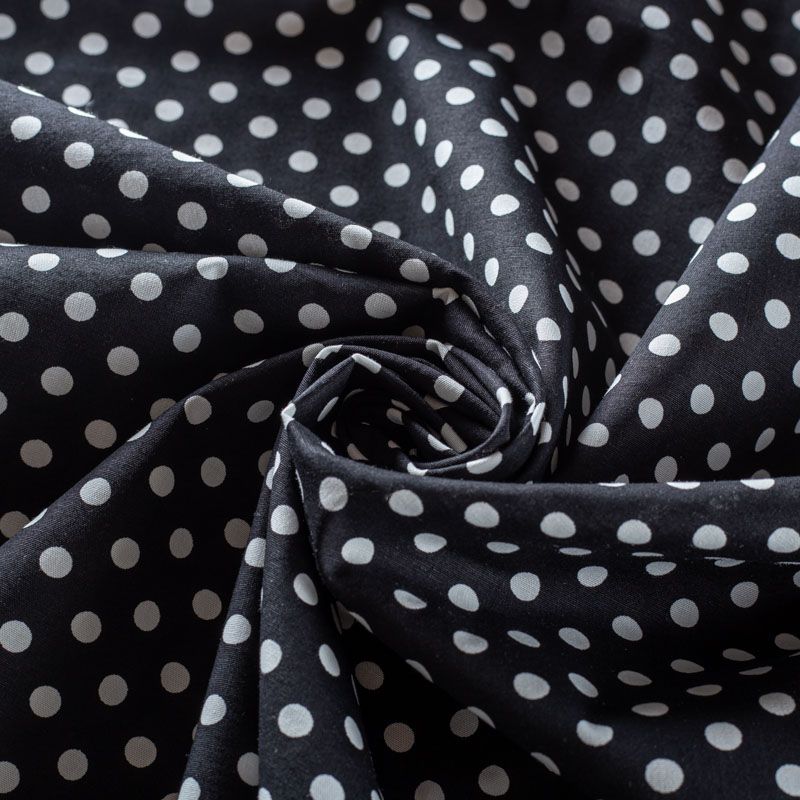 Плательно-блузочная ткань из натурального хлопка с принтом горох. Ткань легкая, тонкая, хорошо "дышит", мягкая, не прозрачная, немного тянется за счет эластана в составе. Подойдет для пошива летнего платья, летящей юбки, блузы, сарафана, комбинезона или рубашки.