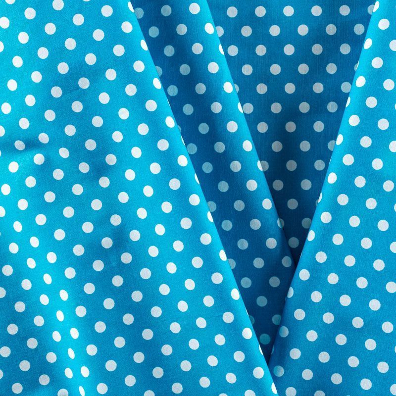 Плательно-блузочная ткань из натурального хлопка с принтом горох. Ткань легкая, тонкая, хорошо "дышит", мягкая, не прозрачная, немного тянется за счет эластана в составе. Подойдет для пошива летнего платья, летящей юбки, блузы, сарафана, комбинезона или рубашки.