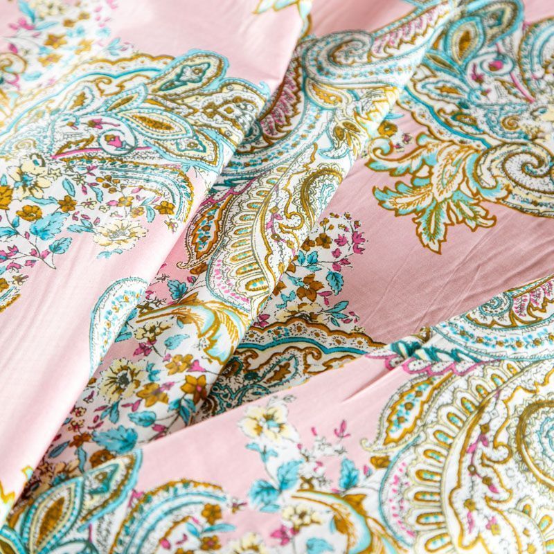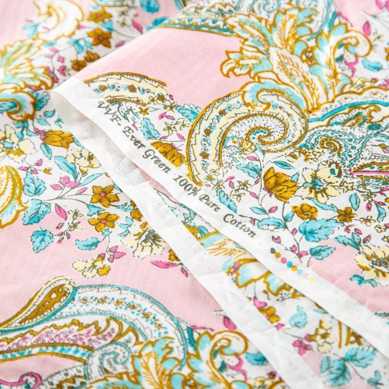Плательно-рубашечная ткань из натурального хлопка с принтом пейсли. Ткань легкая, тонкая, хорошо "дышит", слегка держит форму, не сухая, не прозрачная. Подойдет для пошива летнего платья, летящей юбки, блузы, сарафана, комбинезона или рубашки, а также для домашней одежды.
