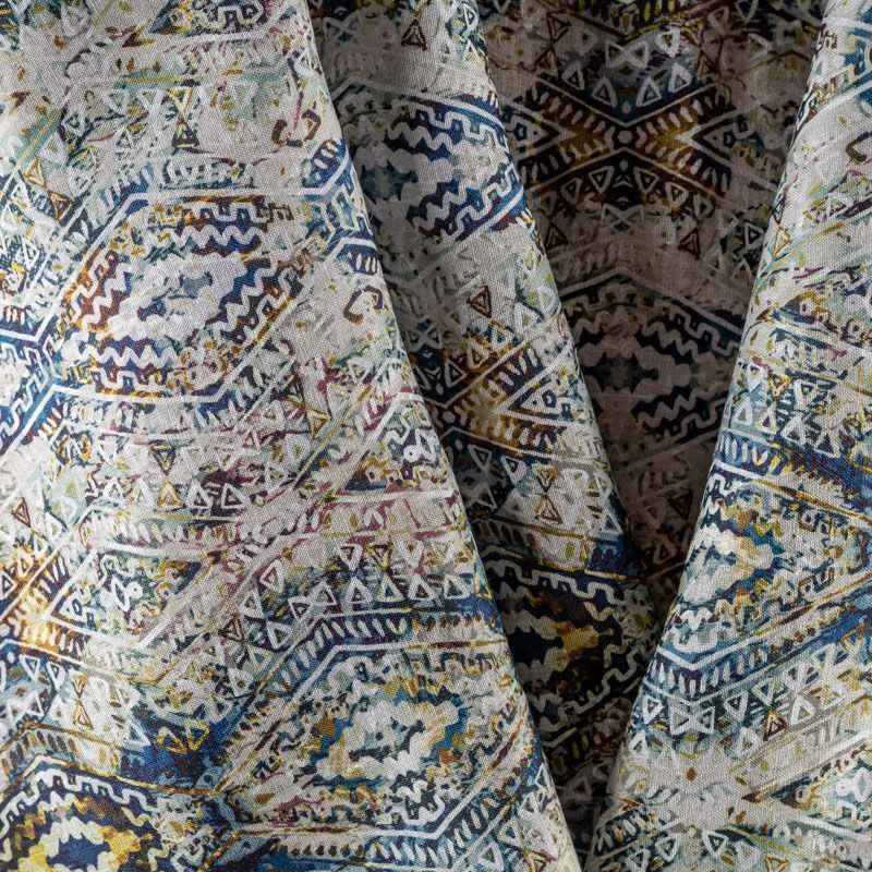 Плательно-блузочная ткань из натурального хлопка с добавлением льна с этническим узором в синих и зеленых тонах на светло-сером фоне. Ткань легкая, тонкая, хорошо "дышит", мягкая, слегка прозрачная, по плотности напоминает батист. Подойдет для пошива летнего платья, летящей юбки, блузы, сарафана, туники или рубашки.