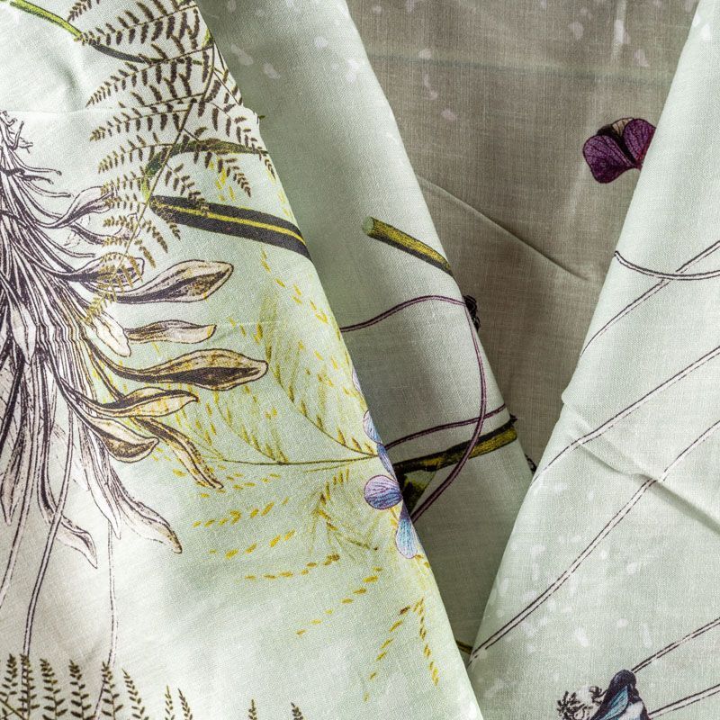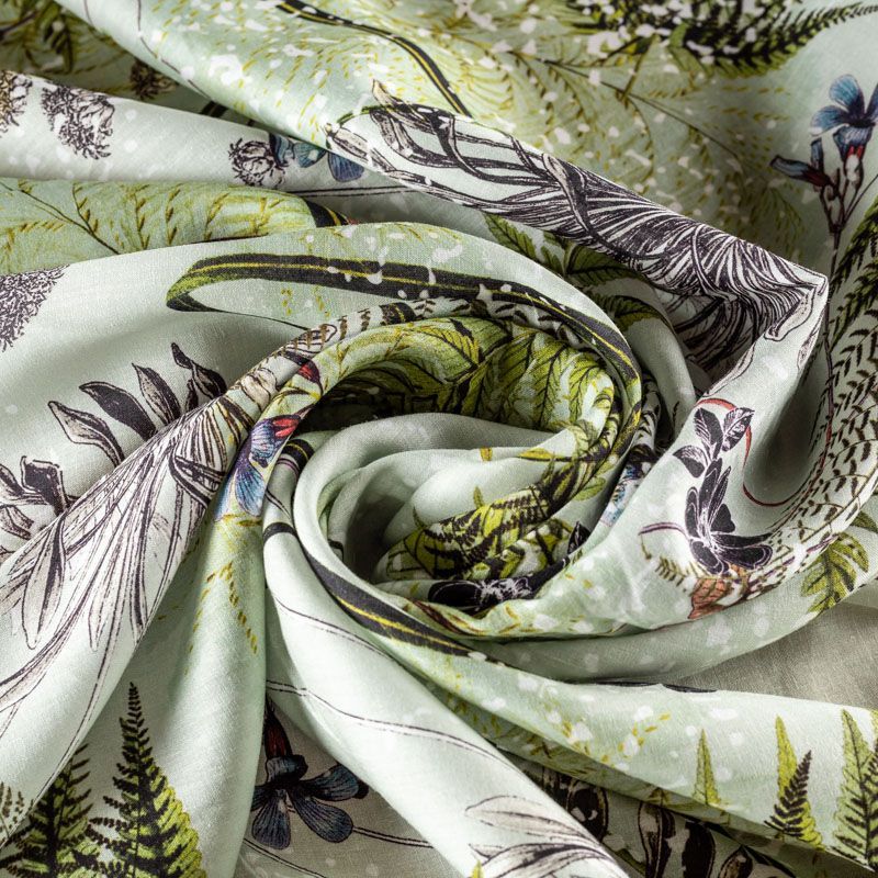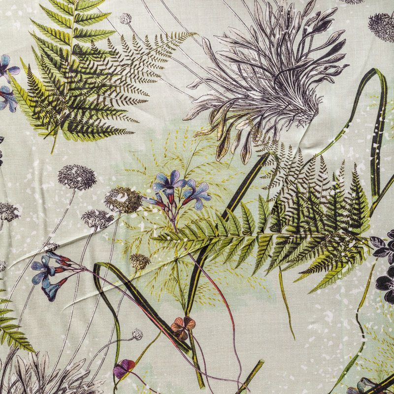 Плательно-блузочная ткань из натурального хлопка с крупным растительным узором на светло-зеленом фоне. Ткань легкая, тонкая, хорошо "дышит", мягкая, слегка прозрачная, по плотности напоминает батист. Подойдет для пошива летнего платья, летящей юбки, блузы, сарафана или рубашки.