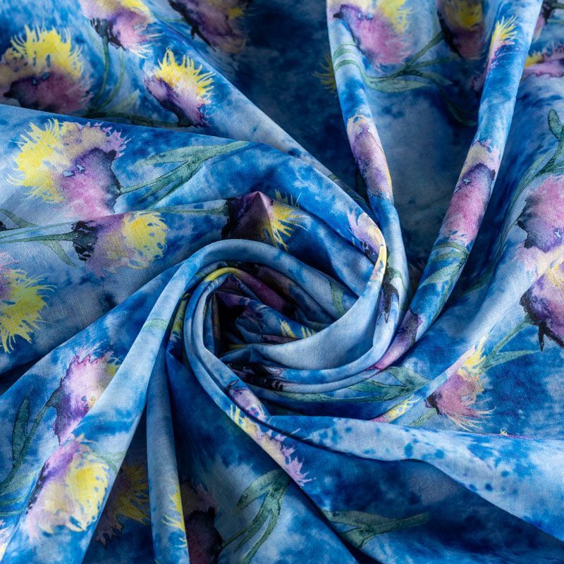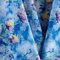 Плательно-блузочная ткань из натурального хлопка с яркими бутонами васильков на сине-голубом фоне. Ткань легкая, тонкая, хорошо "дышит", мягкая, слегка прозрачная, по плотности напоминает батист. Подойдет для пошива летнего платья, летящей юбки, блузы, сарафана или рубашки.