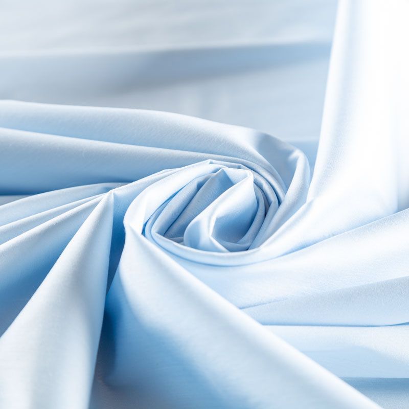 Рубашечно-плательный хлопок разбеленного голубого оттенка. Полотно легкое, средней плотности, очень нежное и пластичное, не держит форму., тянется за счет эластана в составе. Материал отлично драпируется, формируя мягкие складки. Подойдет для прямых, расклешенных моделей платьев, сарафанов, а также юбки, туники, платье-рубашки, топа.