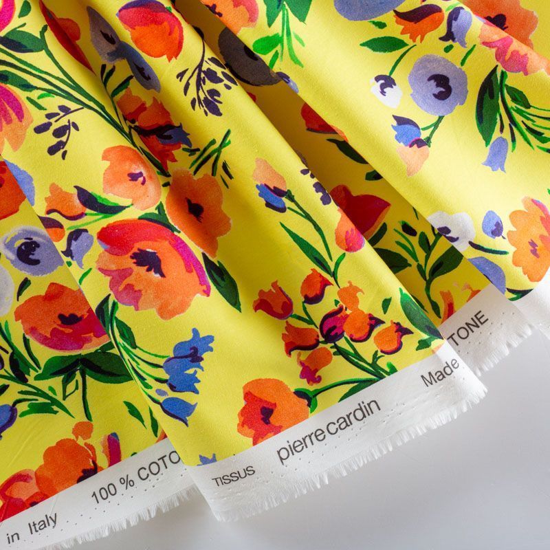 Плательно-рубашечный натуральный хлопок от французского дизайнера с акварельным цветочным принтом на желтом фоне. Ткань имеет плотное переплетение, матовую гладкую поверхность, хорошо держит форму, не прозрачная. Подойдет для пошива рубашек, платья-рубашки, юбки, сарафана, туники, домашней одежды.