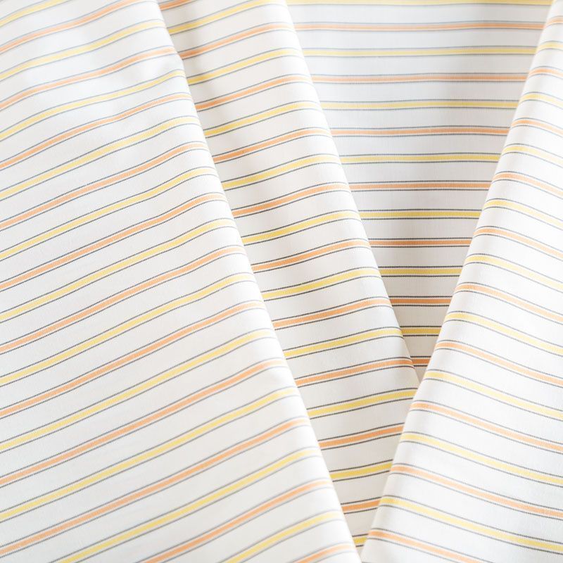 Плательно-рубашечный хлопок в белого цвета освежает не широкая цветная полоска. Ткань мягкая, лёгкая, непрозрачная, пластичная и приятная к телу, хорошо драпируется, имеет гладкую матовую поверхность и сатиновое плетение. Прекрасно подойдет как для пошива платья-рубашки, сарафана, платьев различных фасонов, туники, топа, летнего костюма, комбинезона, мужкой и детской одежды.
