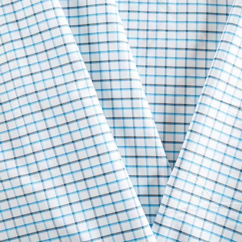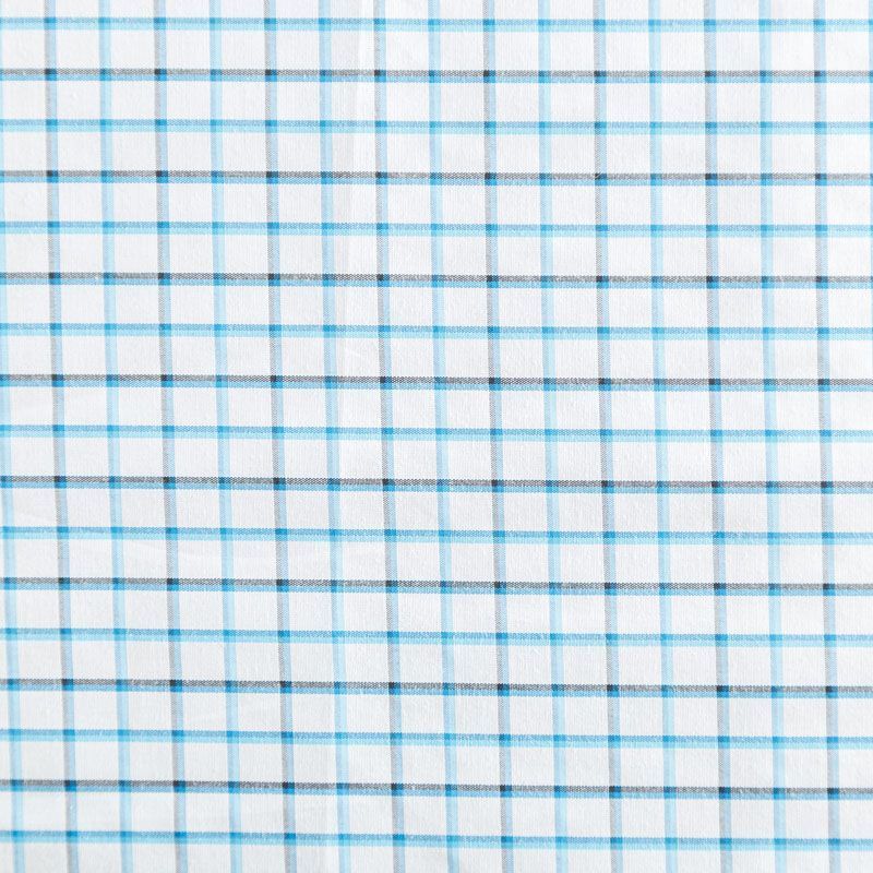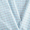 Плательно-рубашечный хлопок в белого цвета в сине-голубую клеточку. Ткань мягкая, лёгкая, непрозрачная, пластичная и приятная к телу, хорошо драпируется, имеет гладкую матовую поверхность и сатиновое плетение. Прекрасно подойдет как для пошива платья-рубашки, сарафана, платьев различных фасонов, туники, топа, летнего костюма, комбинезона, мужкой и детской одежды.