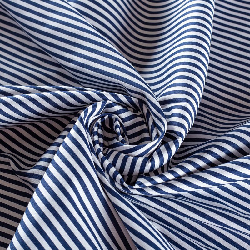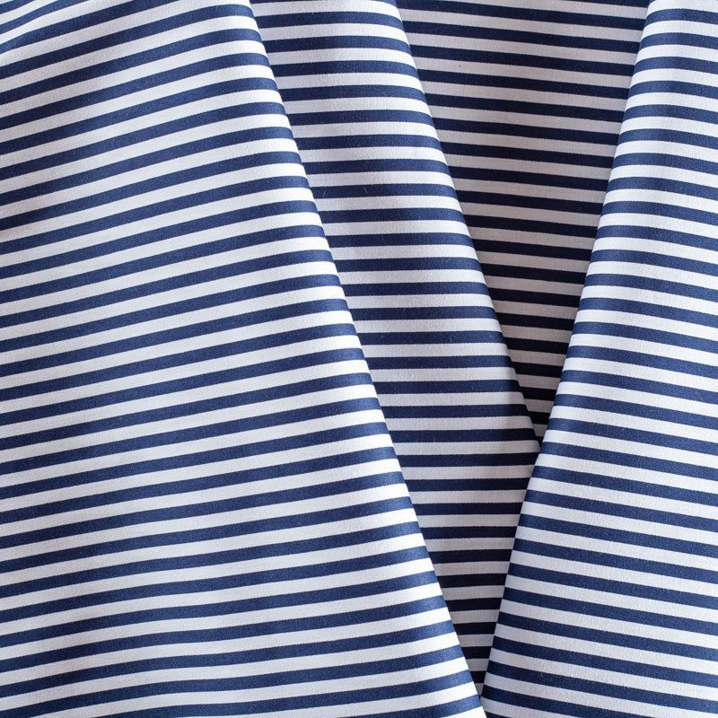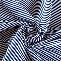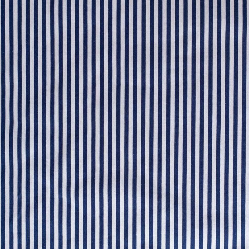 Костюмно-плательный коттон средней плотности в в вертикальную темно-синюю полоску, мягкий, приятный на ощупь, немного держит форму, смотрится красиво. Поверхность ткани матовая, гладкая, полотняного переплетения. Подойдет для пошива костюма, легкого жакета, юбки, платья и других изделий на теплый и прохладный сезоны.