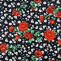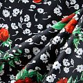 Коттон черного цвета с ярким цветочным принтом. Поверхность гладкая, матовая, ткань средней плотности,  не толстая, хорошо держит форму, тянется за счет эластана в составе. Подойдет для пошива костюма, жакета, юбки, платья, брюк или шорт.