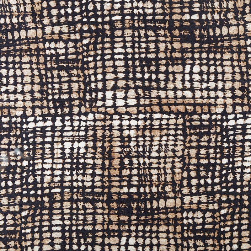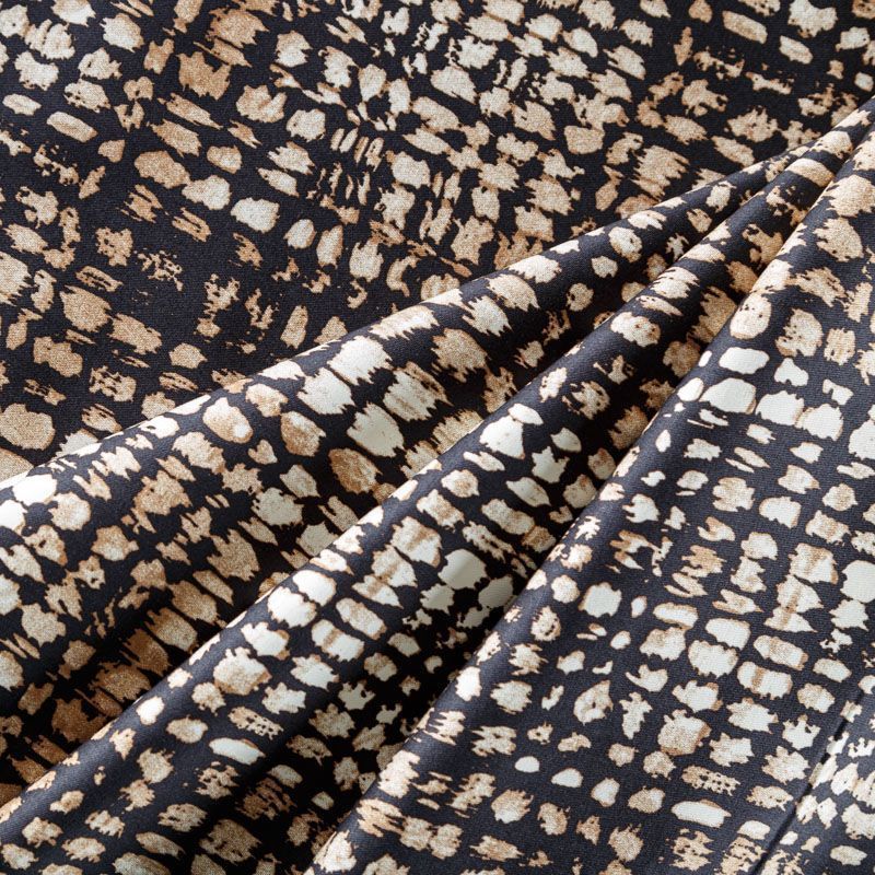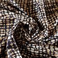 Итальянский коттон бежевого цвета с абстрактным принтом. Поверхность гладкая, матовая, ткань средней плотности,  не толстая, хорошо держит форму, тянется за счет эластана в составе. Подойдет для пошива костюма, жакета, юбки, платья, брюк или шорт.