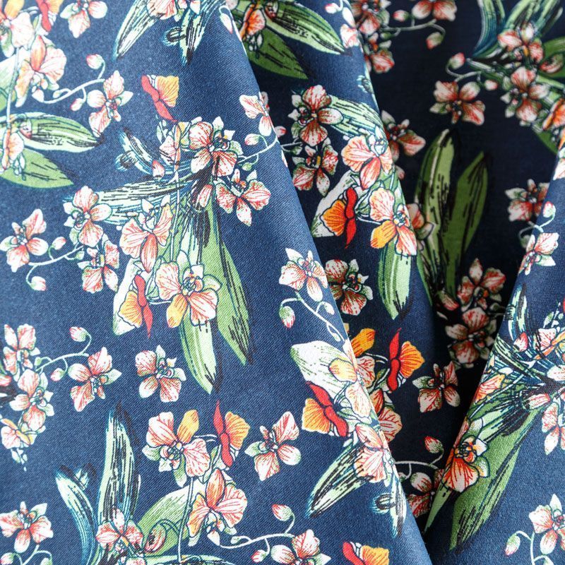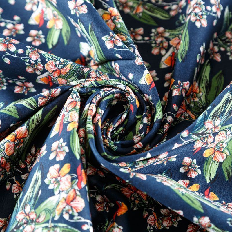 Коттон плательно-костюмной плотности темно-синего оттенка с цветочным принтом. Поверхность гладкая, матовая, хорошо держит форму, тянется за счет эластана в составе. Подойдет для пошива костюма, жакета, юбки, платья, брюк или шорт.