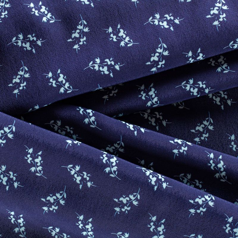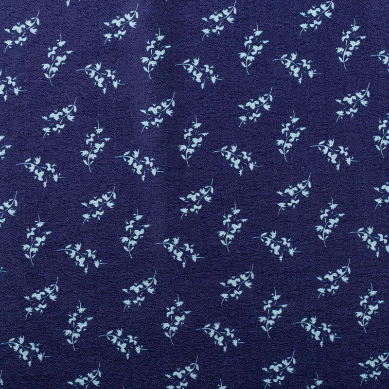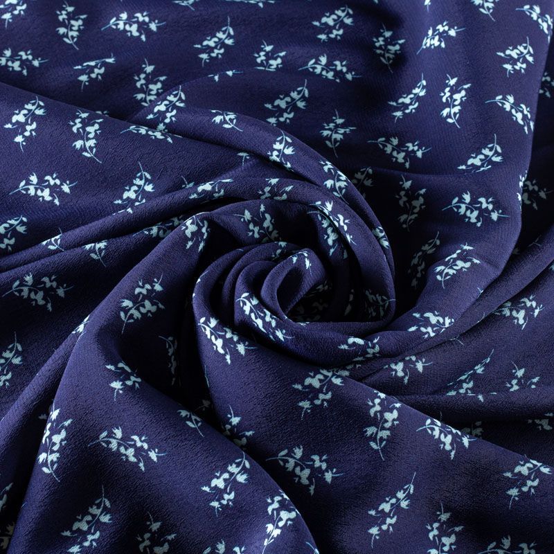 Итальянская натуральная вискозная ткань фиолетово-синего оттенка с растительным принтом. Ткань легкая, хорошо тянется, драпируется струящимися складками, приятная и комфортная в носке. Материал слегка мнется, имеет креповую фактуру. Идеально подходит для пошива  платьев, юбок, блуз, комбинезонов, костюмов, туник, кардиганов.