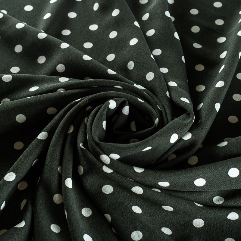 Плательный креп с принтом в горох. Ткань средней плотности, не толстая, пластичная, поверхность полотна матовая, с характерной мелкозернистой фактурой, прочная, хорошо драпирующаяся. Превосходно подойдет для пошива стильного костюма, юбки, платья, комбинезона, топа, брюк.