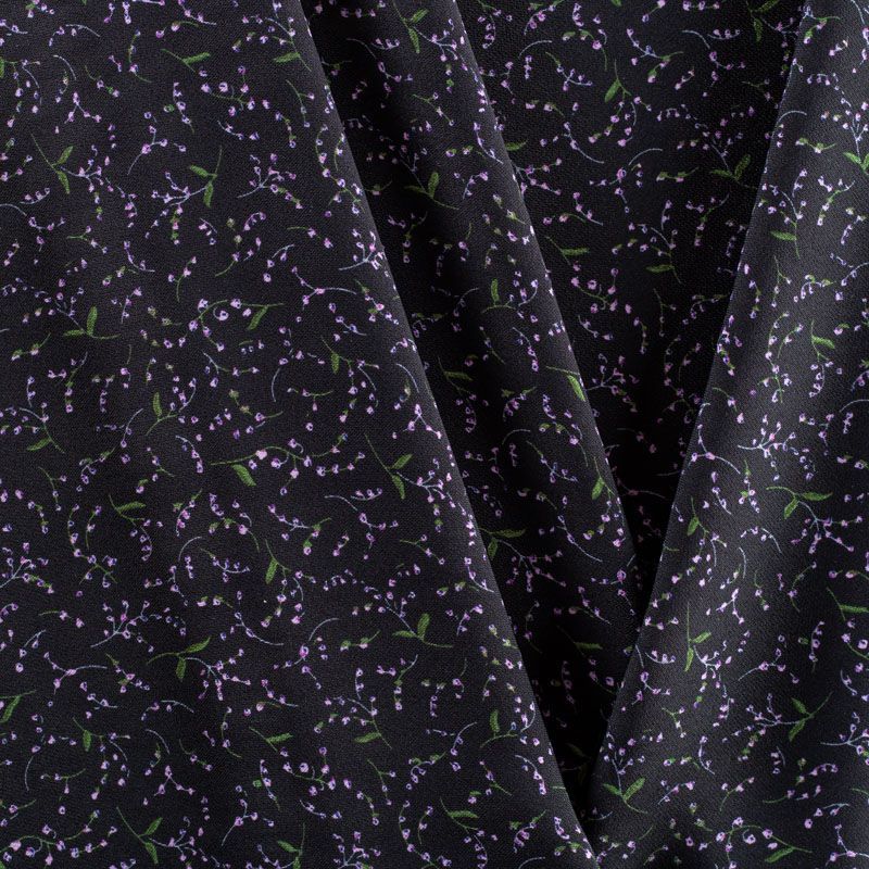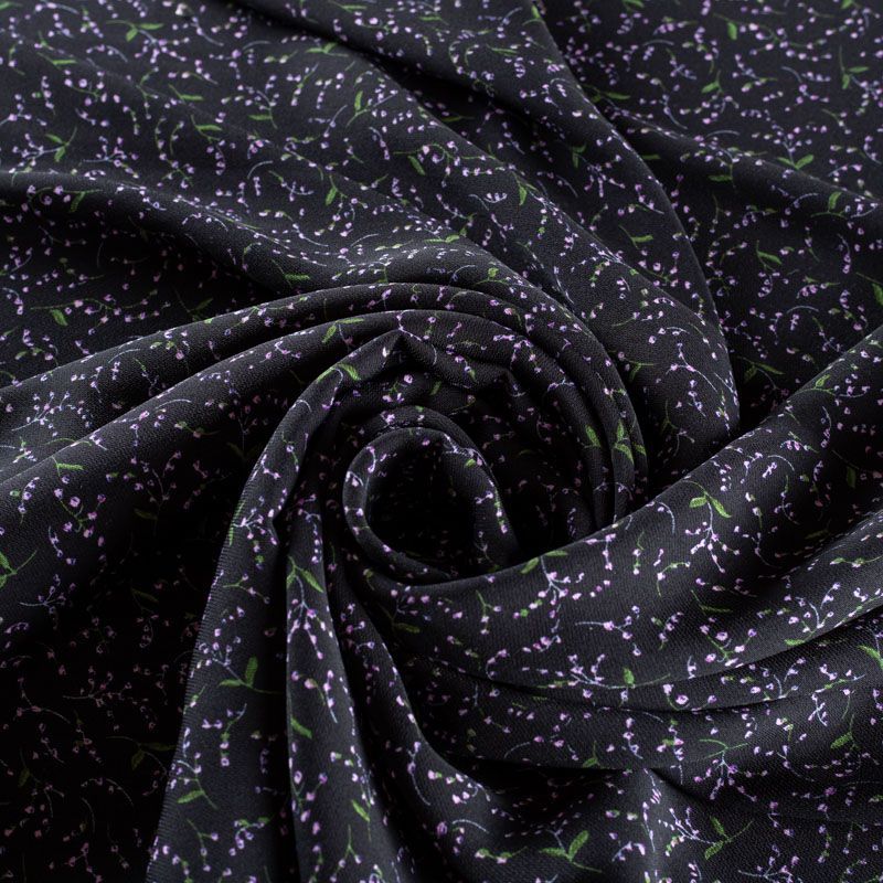 Плательный креп с мелким цветочным принтом. Ткань средней плотности, не толстая, пластичная, поверхность полотна матовая, с характерной мелкозернистой фактурой, прочная, практически не мнется, хорошо драпируется. Превосходно подойдет для пошива стильного костюма, юбки, платья, комбинезона, топа, брюк.