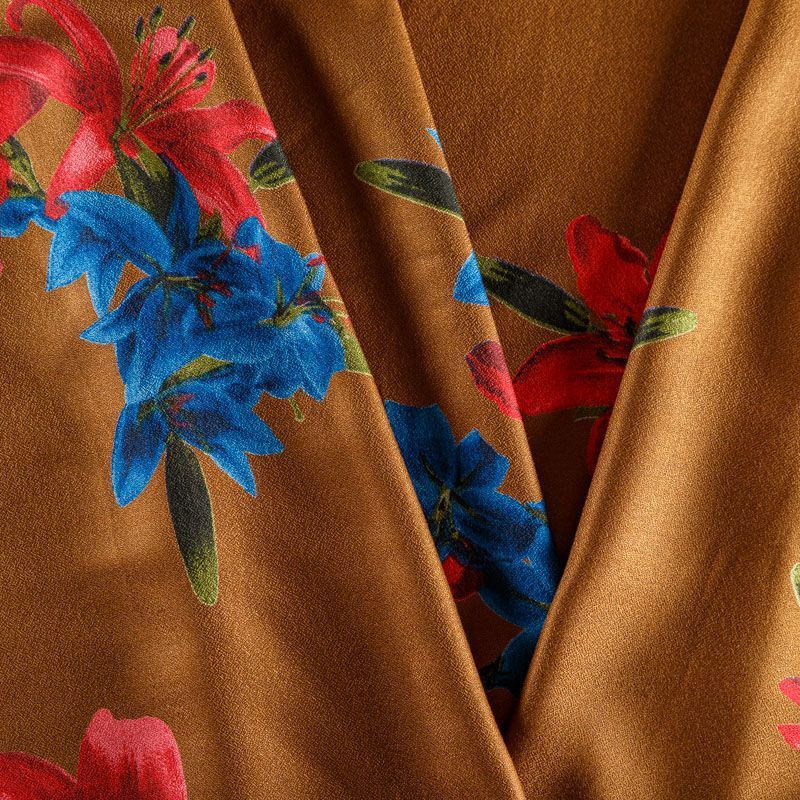 Плательно-блузочный вискозный креп теплого коричневого оттенка с крупным цветочным принтом. Ткань средней плотности, имеет зернистую фактуру и матовую поверхность, не просвечивает, пластичная, хорошо драпируется мягкими складками, струится. Подходит для пошива платья и сарафана, юбки, блузки, туники, топа, комбинезона.