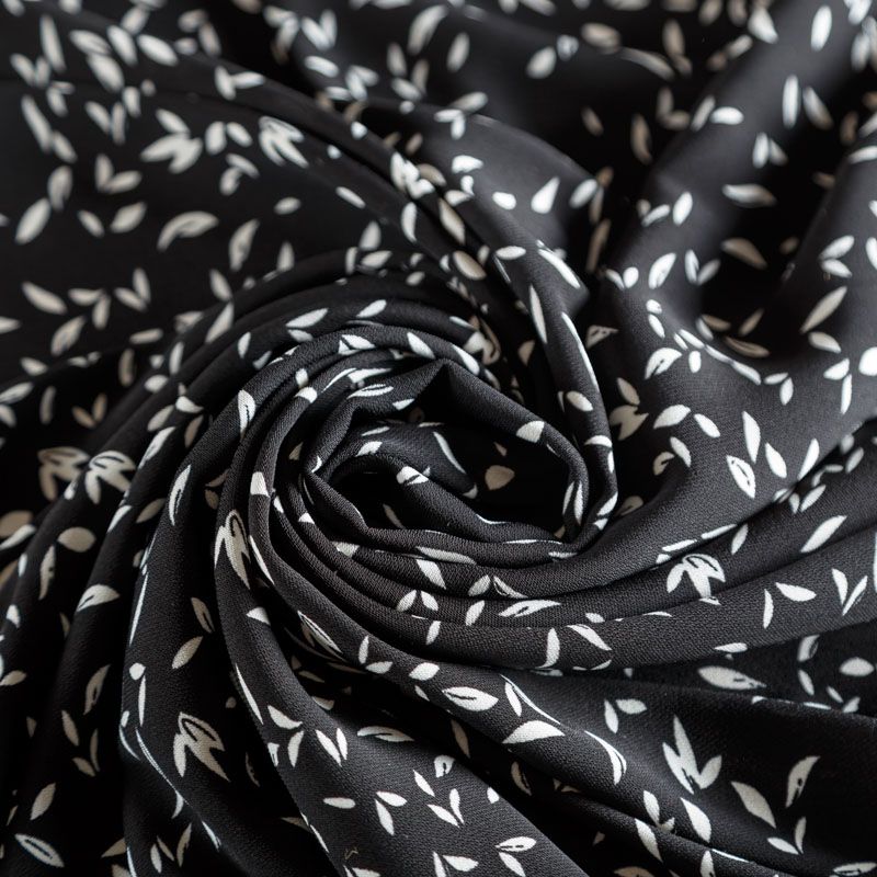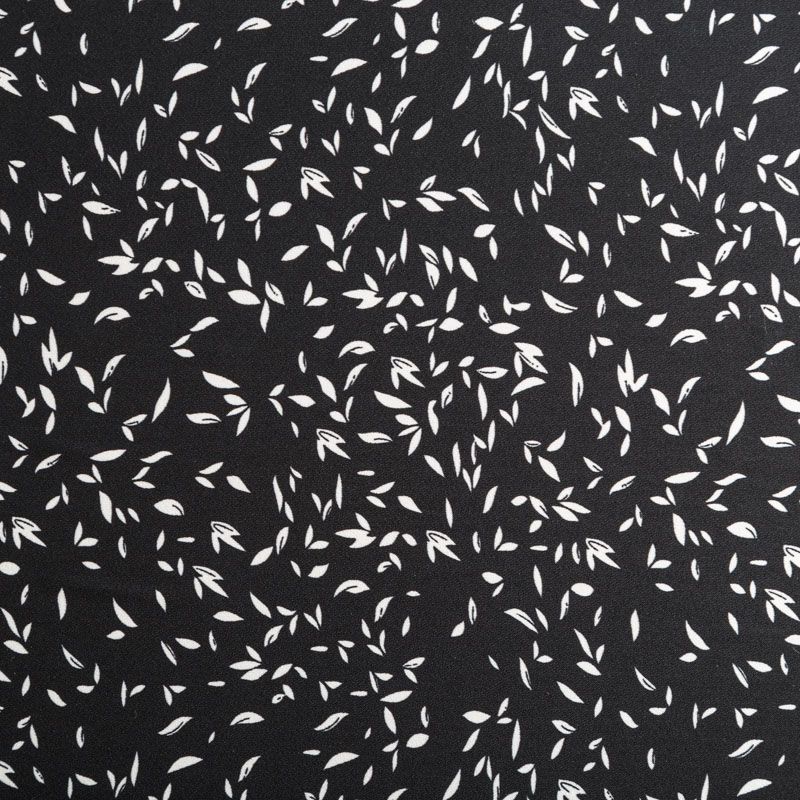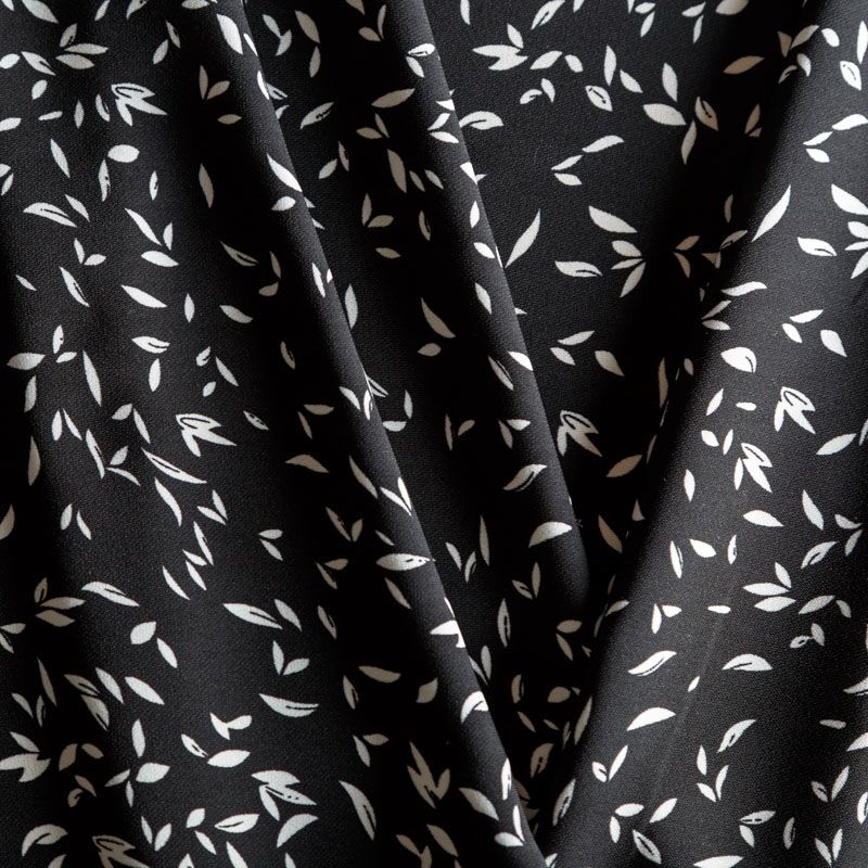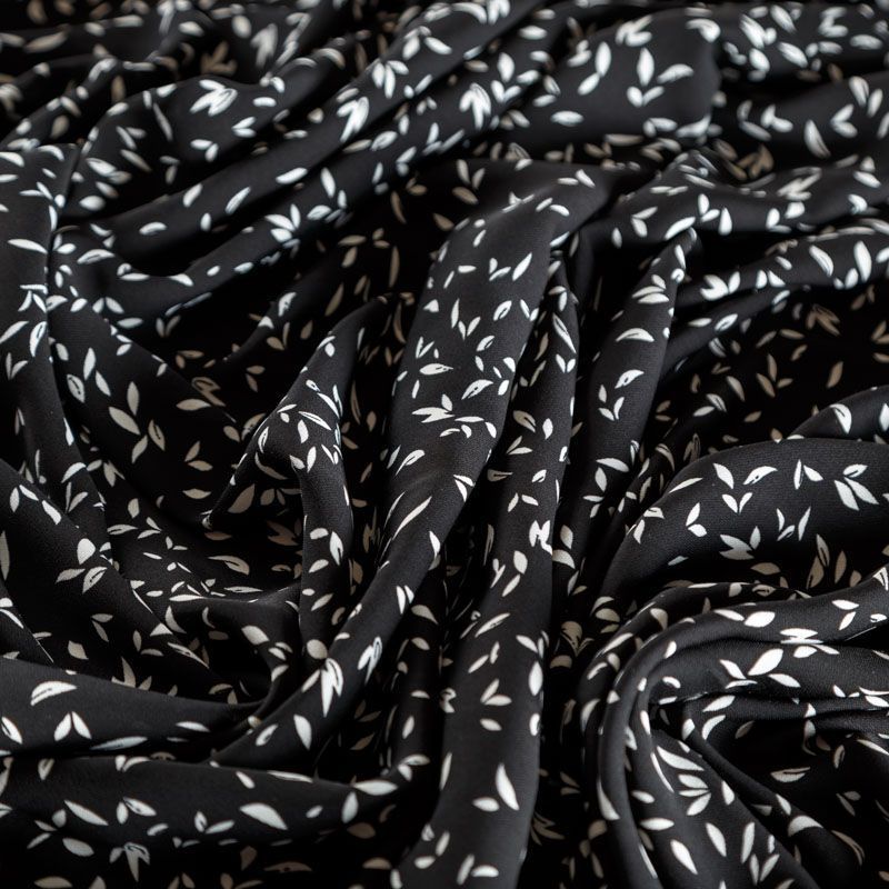 Плательный креп с мелким растительным принтом на черном фоне, приятный и комфортный в носке, не мнется и не прозрачен на свету, имеет мелкозернистую матовую поверхность. Идеально подойдет для пошива платья, юбки, широких брюк, комбинезона, блузки, топа или туники.