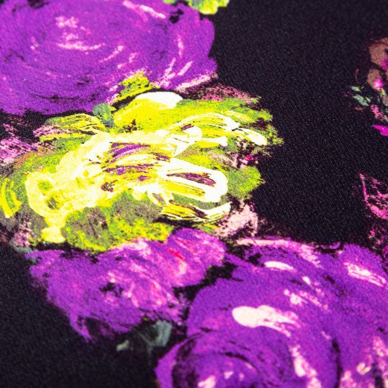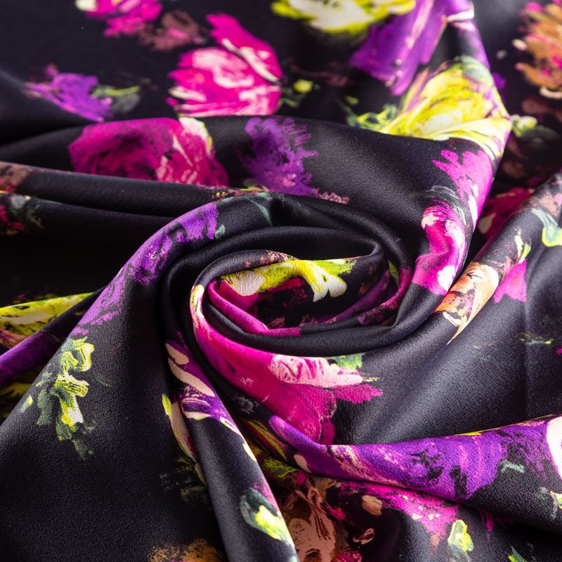 Итальянский вискозный креп-атлас плательной плотности глубокого черного цвета с ярким акцентным принтом. Поверхность имеет заметный блеск, на ощупь гладкая, приятная и упругая. Ткань малосминаемая, тянется за счет эластана в составе, красиво драпируется, струится и дает объемную складку, не просвечивает. Идеально подойдет для шикарного платья, блузы, юбки, комбинезона, брюк свободного кроя.