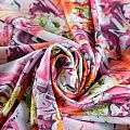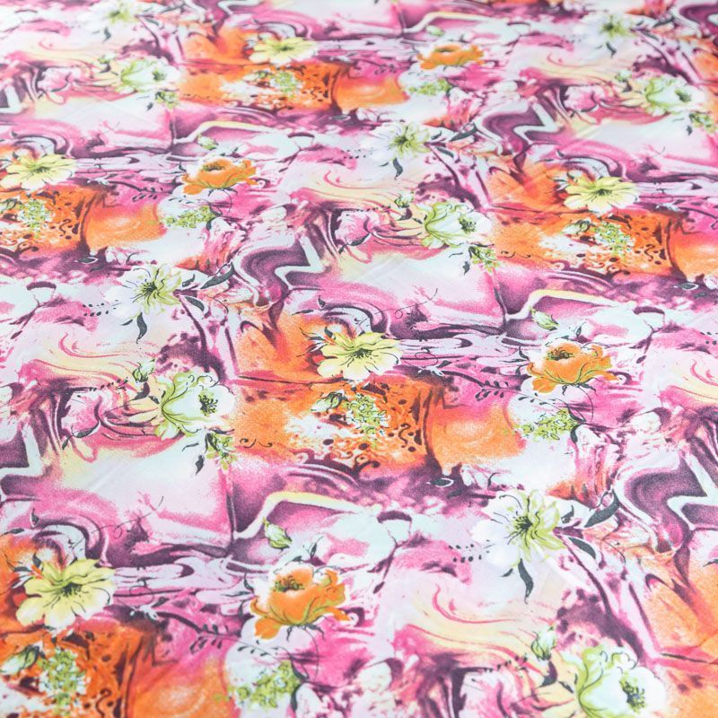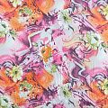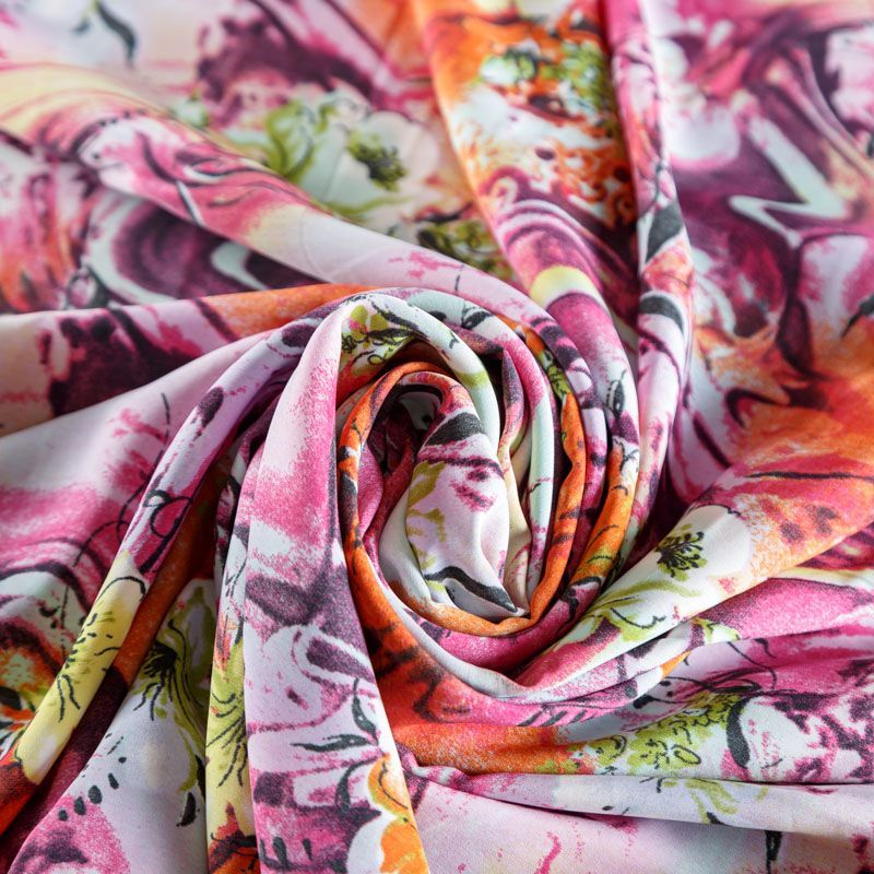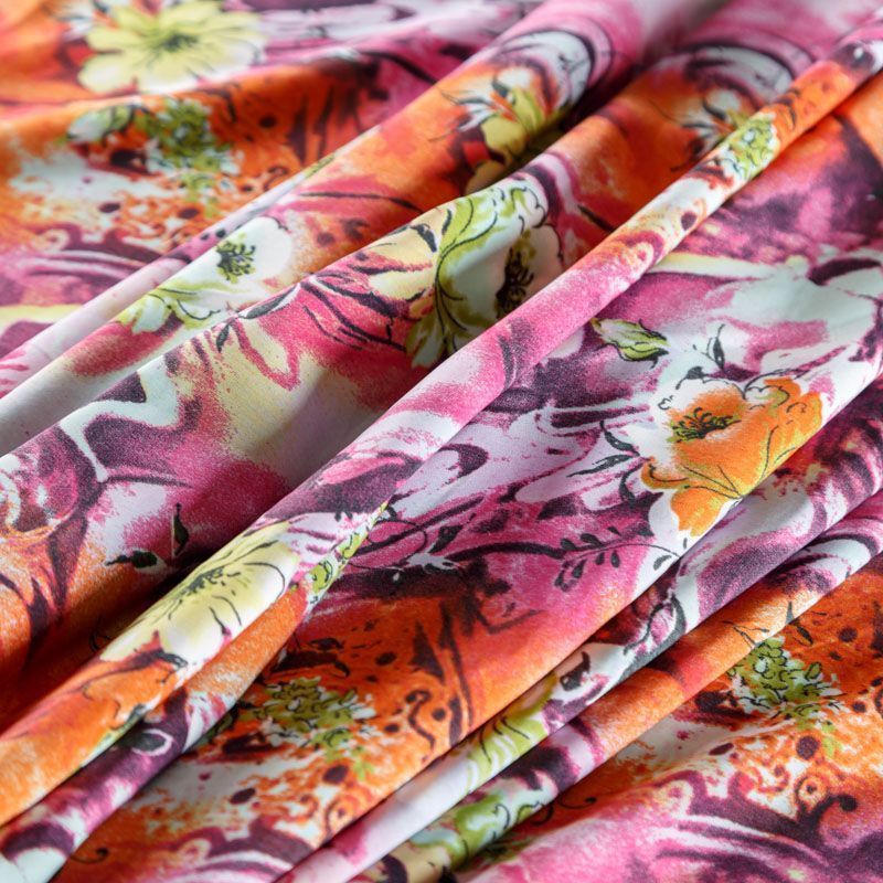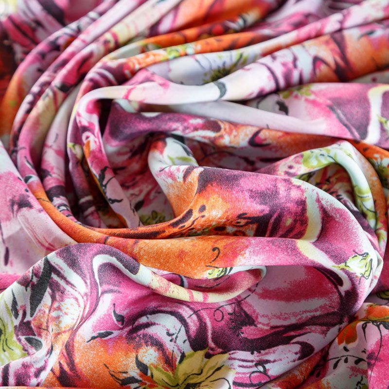 Плательный креп с цветочным принтом. Ткань средней плотности, не толстая, пластичная, поверхность полотна матовая, с характерной мелкозернистой фактурой, прочная, практически не мнется, хорошо драпируется. Превосходно подойдет для пошива стильного костюма, юбки, платья, комбинезона, топа, брюк.