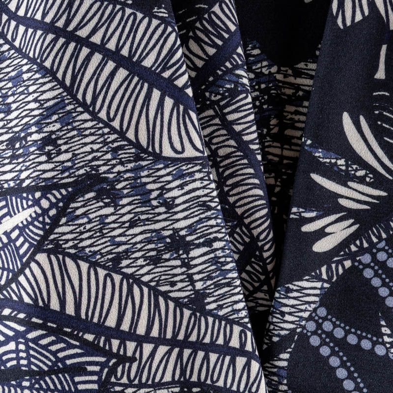 Натуральная вискозная ткань с абстрактным принтом в синих оттенках. Легкая, хорошо тянется, драпируется струящимися складками, приятная и комфортная в носке. Идеально подходит для пошива платьев, юбок, блуз, комбинезонов. Материал слегка мнется и прозрачен на свету, имеет креповую фактуру.