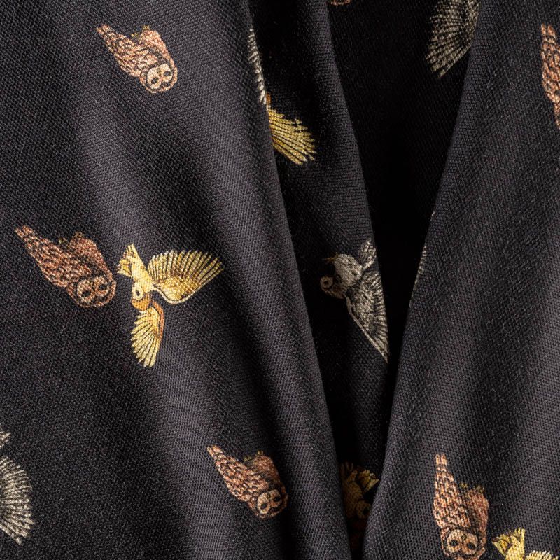 Плотный креп из вискозы с ярким принтом в виде милых совушек на черном фоне. Ткань хорошо держит форму, почти не мнется, имеет заметную фактуру пике и очень прочная - подходит для пошива эффектных бомберов, юбок, платьев в спортивном стиле или легких пальто и жакетов.