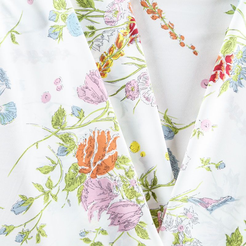Креп-шифон легкий, воздушный, мягкий и нежный, прекрасно драпируется, тянется, приятен к телу, полупрозрачный, может потребоваться подклад. Текстура матовая, без блеска. Идеален для нежных платьев летящих силуэтов, топов, туник, блузок, юбок с роскошными драпировками и воланами.