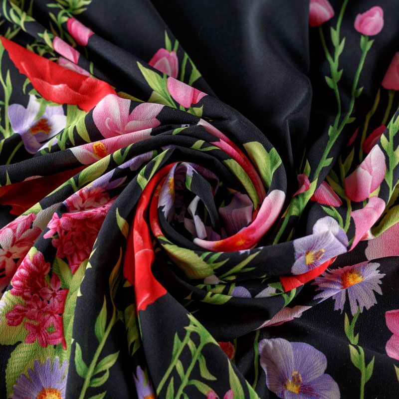 Креп-шифон легкий, воздушный, мягкий и нежный, прекрасно драпируется, тянется, приятен к телу, полупрозрачный, может потребоваться подклад. Поверхность шероховатая, матовая, без блеска. Тянется за счет эластана в составе. Идеален для нежных платьев летящих силуэтов, топов, туник, блузок, юбок с роскошными драпировками и воланами. Набирается на изделие объемом.