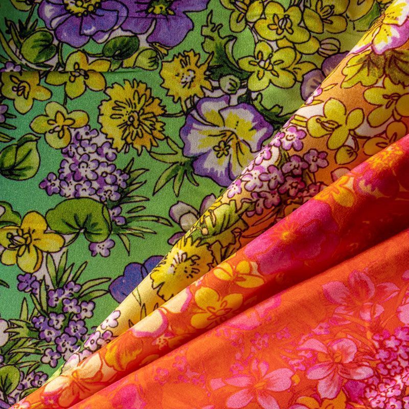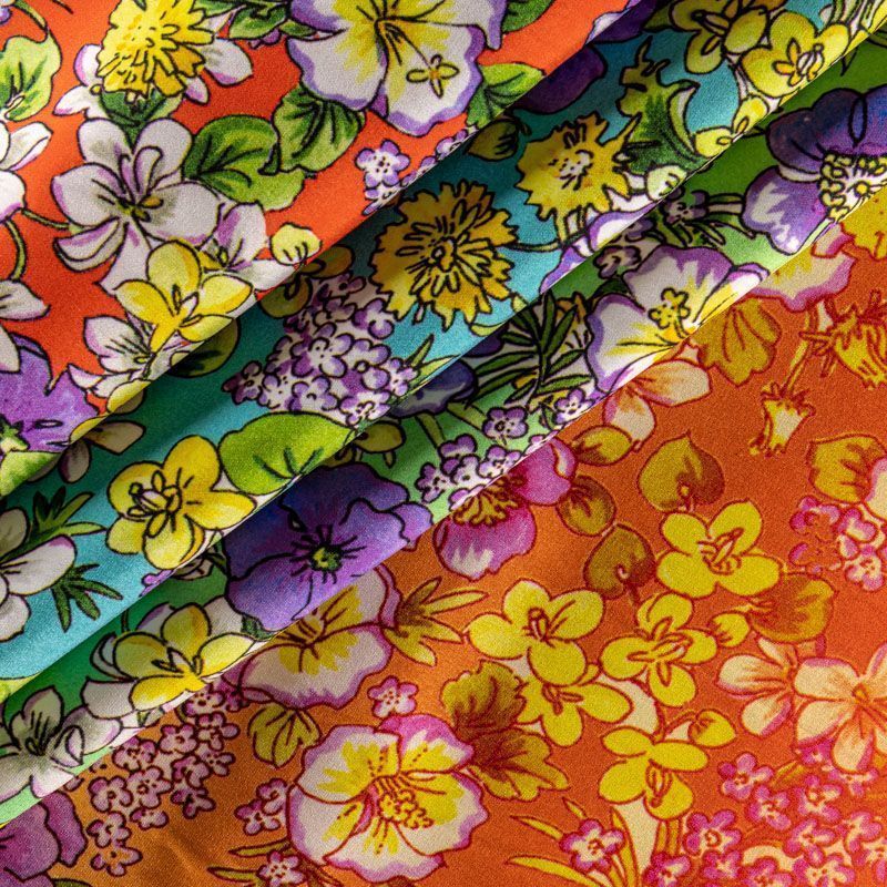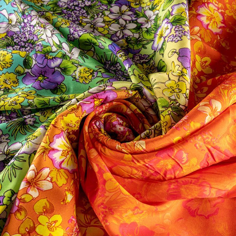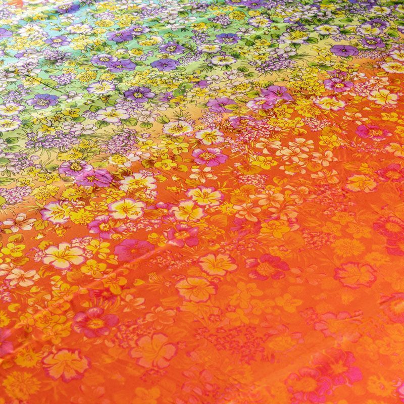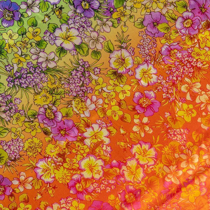 Натуральный шелковый крепдешин с эффектом деграде с плавным переходом от бирюзового до оранжевого цвета, дополненный цветочным принтом, подойдет для ценителей ярких образов. Ткань имеет матовую поверхность, легкая, тонкая, струящаяся, хорошо драпируется, тянется за счет эластана в составе. Будет идеальна для пошива летнего сарафана, платья, блузки, костюма в пижамном стиле, широких брюк или юбки.