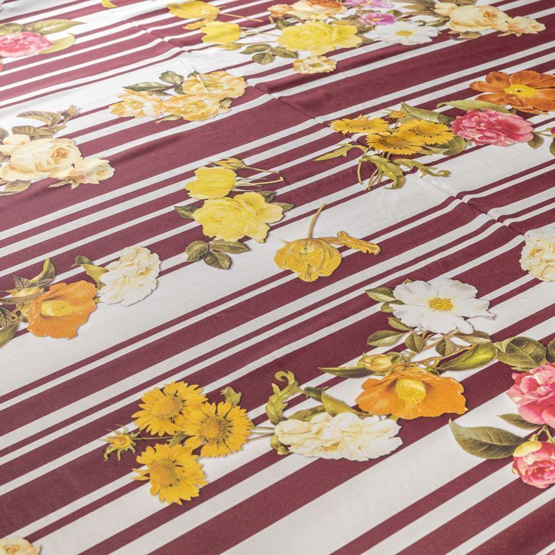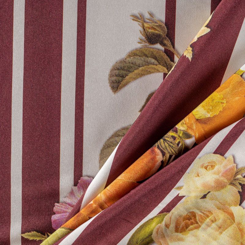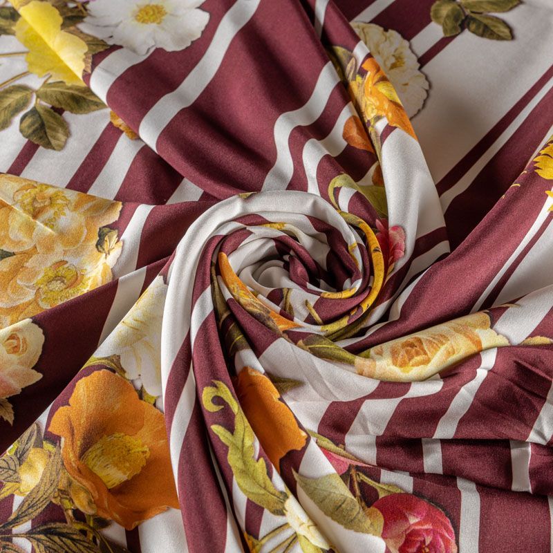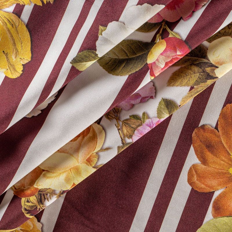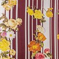 Натуральный шелковый крепдешин с продольными полосами темно-бордового оттенка, дополненный крупным цветочным принтом, подойдет для ценителей смелых образов. Ткань имеет матовую поверхность, легкая, тонкая, струящаяся, хорошо драпируется. Будет идеальна для пошива летнего сарафана, платья-рубашки, блузки, костюма в пижамном стиле, широких брюк или юбки.