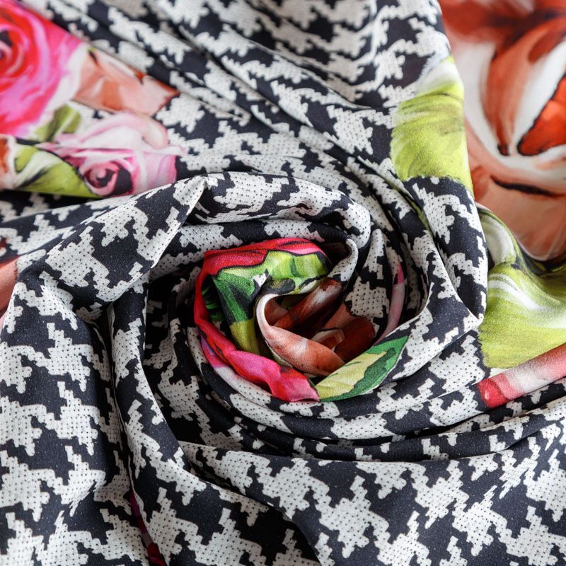 Итальянский крепдешин с матовой лицевой поверхностью с принтом гусиная лапка и цветами, тонкий, слегка прозрачный, отлично драпируется, тянется за счет эластана в составе, легкий и струящийся. Идеально подойдет для пошива платьев и сарафанов расклешенных моделей, с воланами, летящих юбок, топов, блузки, костюма в пижамном стиле.