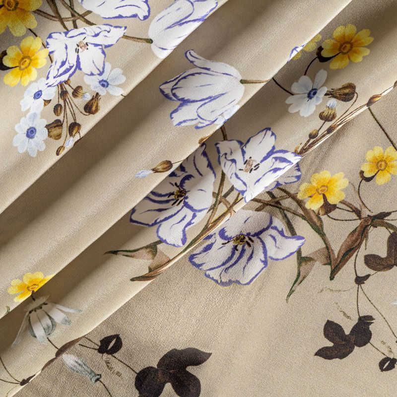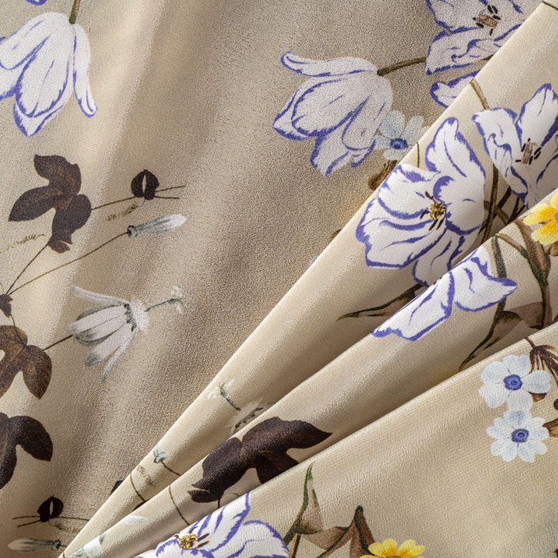 Натуральный шелковый крепдешин с матовой поверхностью, легкий, струящийся, хорошо драпируется. Нежный цветочный принт на спокойном оливковом фоне будет уместен для пошива летнего сарафана, платья, блузки, костюма в пижамном стиле, широких брюк или юбки.
