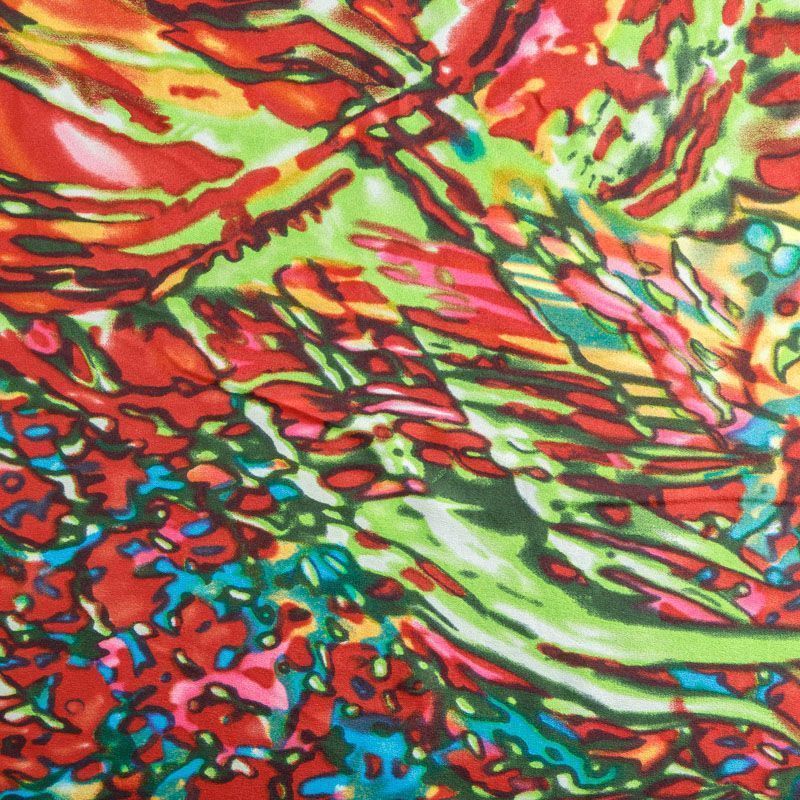 Итальянский крепдешин с матовой лицевой поверхностью с абстрактным ярким принтом на салатовом фоне, тонкий, слегка прозрачный, отлично драпируется, легкий и струящийся. Идеально подойдет для пошива платьев и сарафанов расклешенных моделей, с воланами, летящих юбок, топов, блузки, костюма в пижамном стиле.