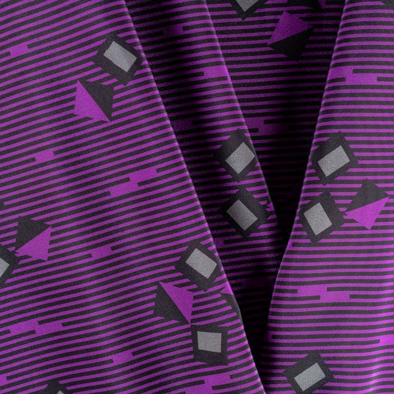 Тонкий и легкий крепдешин с абстрактным принтом в фиолетовых и черных тонах. Ткань мягкая, нежная, струящаяся, красиво драпируется, приятная к телу, поверхность матовая, с благородным блеском. Прекрасно подойдет для пошива блузы, платья, юбки, легких свободных брюк или комбинезона.