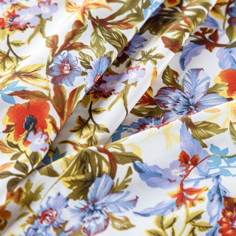 Крепдешин с цветочным летним принтом, тонкий, легкий, фактурный, приятный на ощупь. Очень пластичный, тянется за счет эластана в составе, прекрасно драпируется и струится. Ткань слегка просвечивает, можно использовать подклад. Идеально будет смотреться в платье, юбке, тунике, рубашке или блузке.