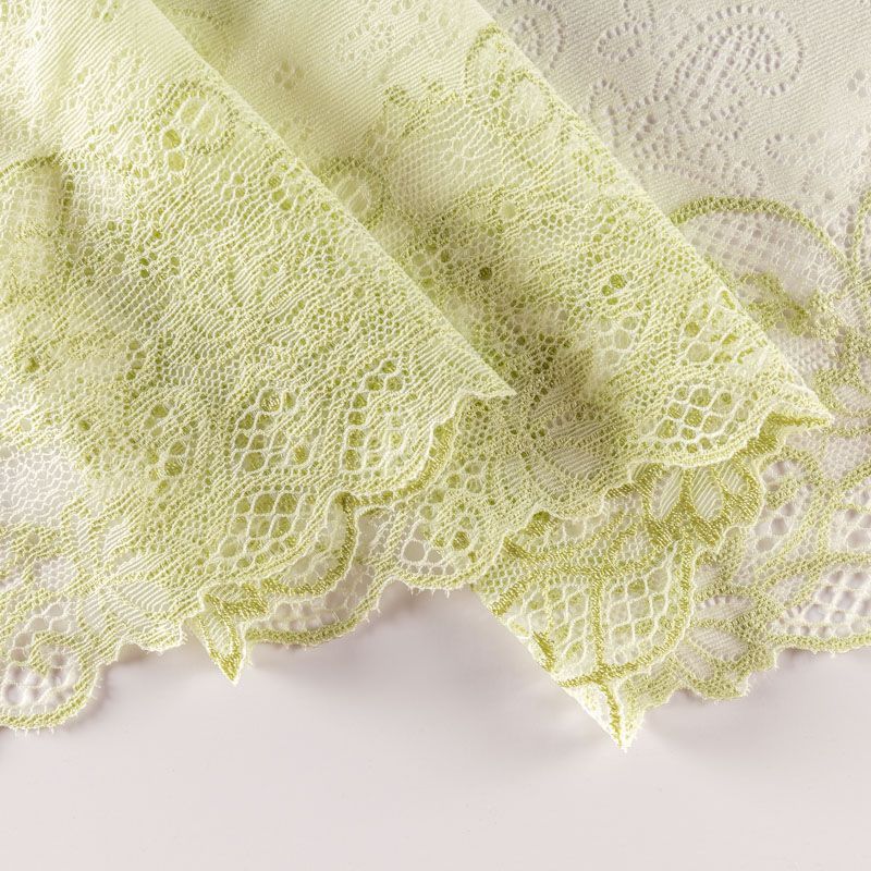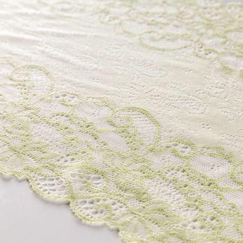 Эластичное кружево сочетает в себе мягкость, прочность и красоту, благодаря своей упругости оно долго не теряет первоначальную форму. Используется для пошива нижнего белья, а так же применяется как отделочный декор в одежде.