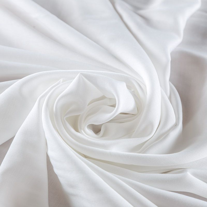Купро плательно-костюмной плотности белого оттенка. Ткань мягкая, пластичная, струящаяся, отлично драпируется, не просвечивает. Поверхность ткани бархатистая, похожа на мокрый шелк. Идеально подойдет для платьев свободного силуэта, брюк-палацио, юбок, шорт, туник, платья-рубашки, блузы.