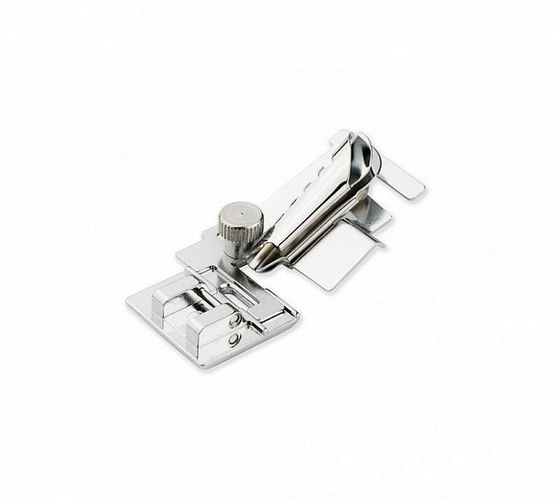 Лапка используется для обработки края ткани отделочной тесьмой или косой бейкой за один прием. Край материала приобретает ровный и аккуратный вид, без дополнительных трудозатрат и идеально ровной строчкой. Подходит косая бейка от 10 до 14 мм. Дополнительный декоративный эффект может быть получен при использовании зигзагообразного или декоративного стежка.