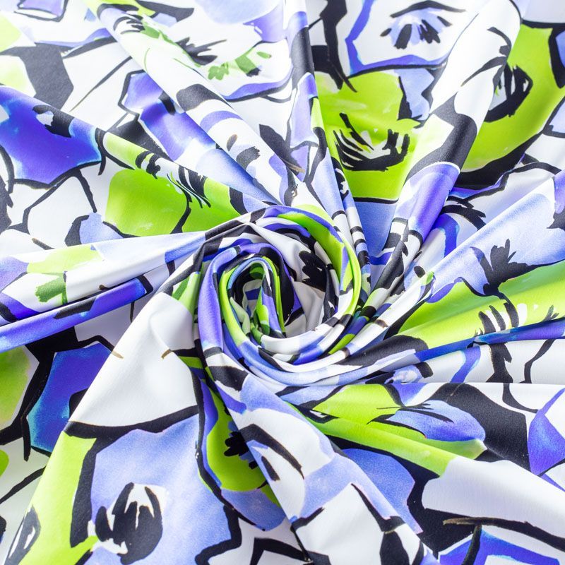 Итальянский бифлекс со стилизованным цветочным принтом. Поверхность ткани матовая и гладкая. Отлично тянется, одежда из него не сковывает движения. Хорошо впитывает влагу и быстро высыхает, не вызывет аллергии и раздражения. Используется для пошива эстрадных, спортивных костюмов, купальников, боди.