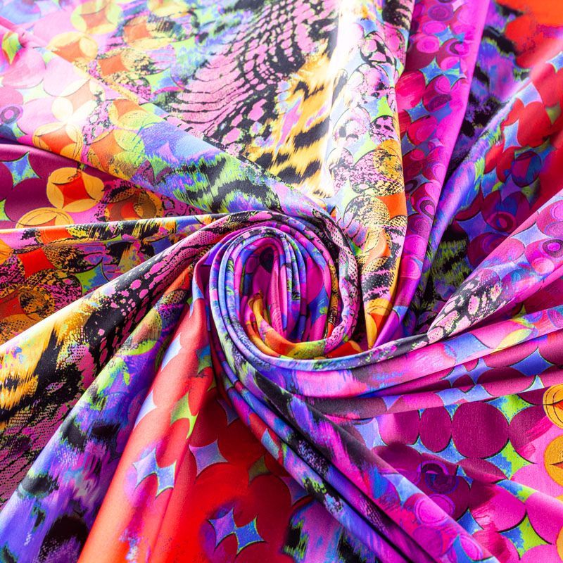 Итальянский бифлекс с насыщенным по форме, рисунку и цвету абстрактным принтом. Поверхность ткани матовая и гладкая. Отлично тянется, одежда из него не сковывает движения. Хорошо впитывает влагу и быстро высыхает, не вызывет аллергии и раздражения. Используется для пошива эстрадных, спортивных костюмов, купальников, боди.