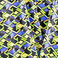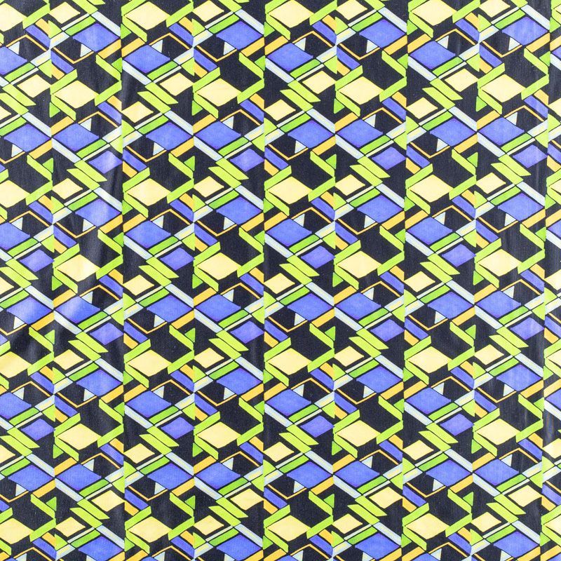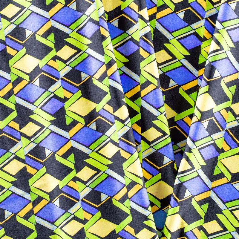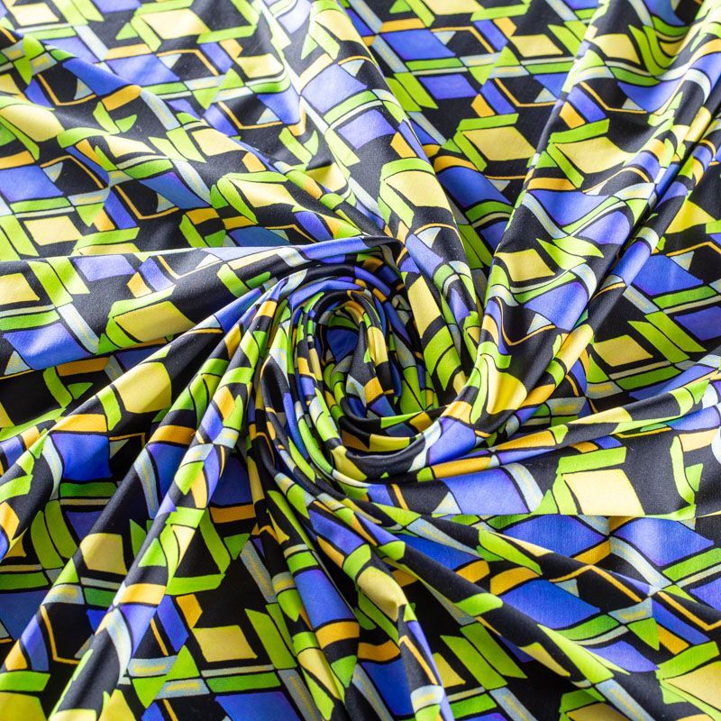 Итальянский бифлекс с разноцветным геометрическим принтом. Поверхность ткани матовая и гладкая. Отлично тянется, одежда из него не сковывает движения. Хорошо впитывает влагу и быстро высыхает, не вызывет аллергии и раздражения. Используется для пошива эстрадных, спортивных костюмов, купальников, боди.