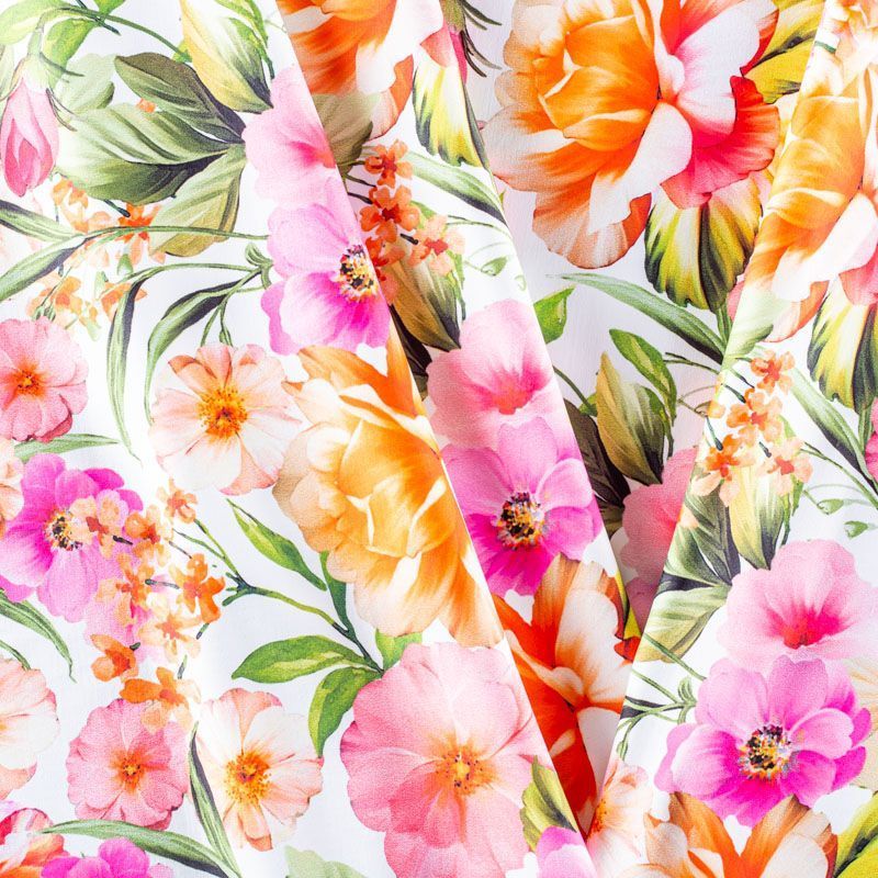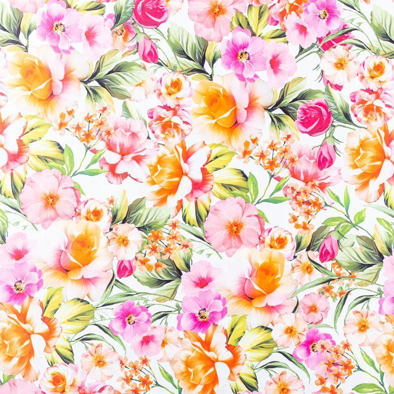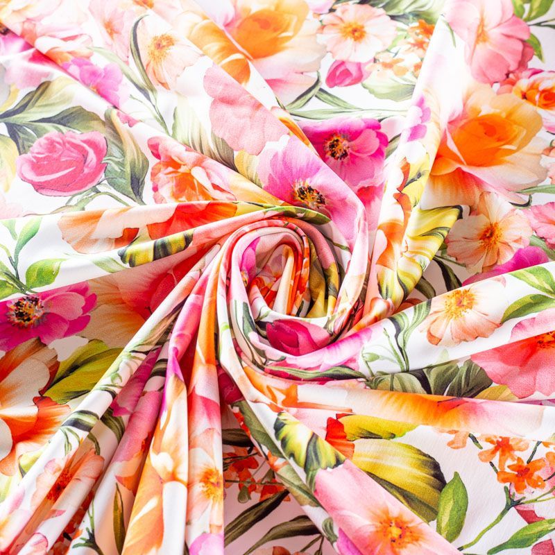 Итальянский бифлекс с ярким цветочным принтом. Поверхность ткани матовая и гладкая. Отлично тянется, одежда из него не сковывает движения. Хорошо впитывает влагу и быстро высыхает, не вызывет аллергии и раздражения. Используется для пошива эстрадных, спортивных костюмов, купальников, боди.