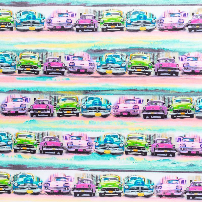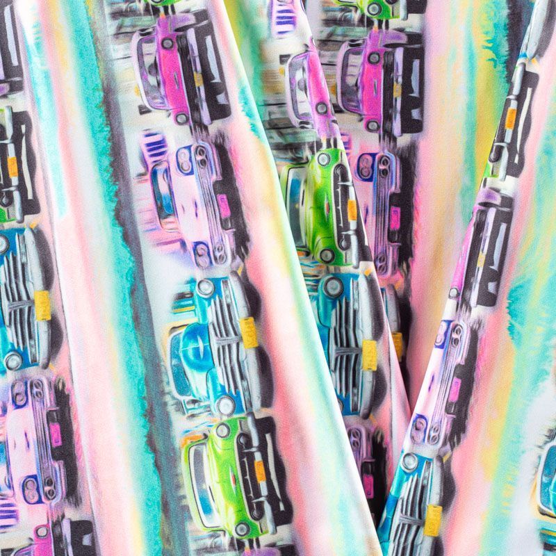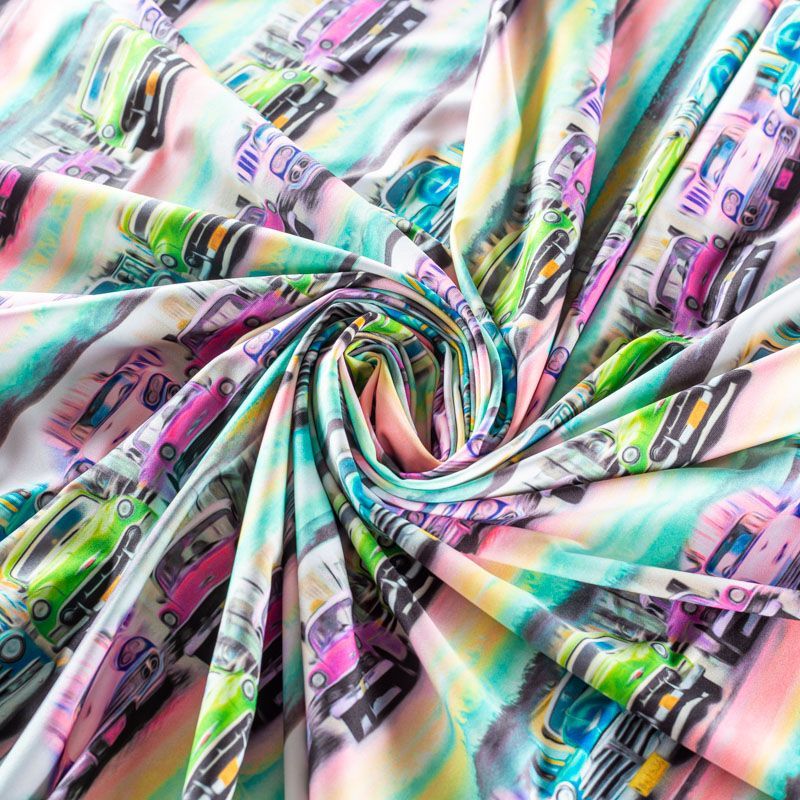 Итальянский бифлекс с ярким реалистичным фотопринтом. Рисунок расположен перпендикулярно кромке. Поверхность ткани матовая и гладкая. Отлично тянется, одежда из него не сковывает движения. Хорошо впитывает влагу и быстро высыхает, не вызывет аллергии и раздражения. Используется для пошива эстрадных, спортивных костюмов, купальников, боди.