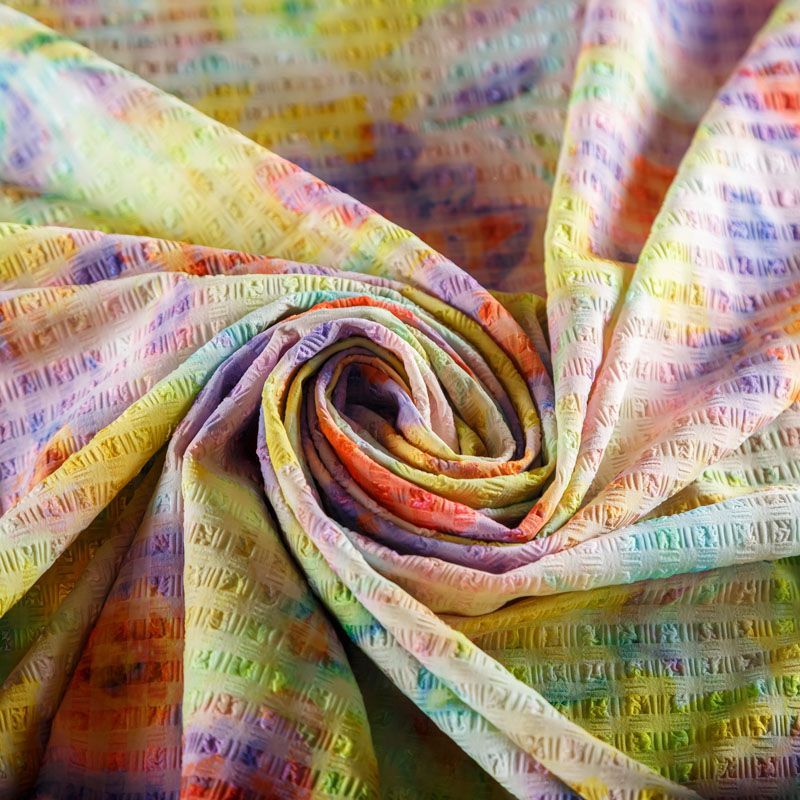 Итальяская качественная, красивая и приятная на ощупь лайкра желтого цвета в цветочным принтом в ярких оттенках. Поверхность ткани матовая, с жаккардовой фактурой и имитацией жатки. Идеально облегает фигуру, тянется по двум направлениям, хорошо драпируется, отлично держит форму, устойчива к пилингу, долговечна и гигроскопична. Используется для пошива одежды для танцев, гимнастики, фигурного катания, для велоспорта, легкой атлетики и аэробики, фитнеса и других видов спорта, для купальников, женского белья, театральных, цирковых и эстрадных костюмов.