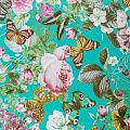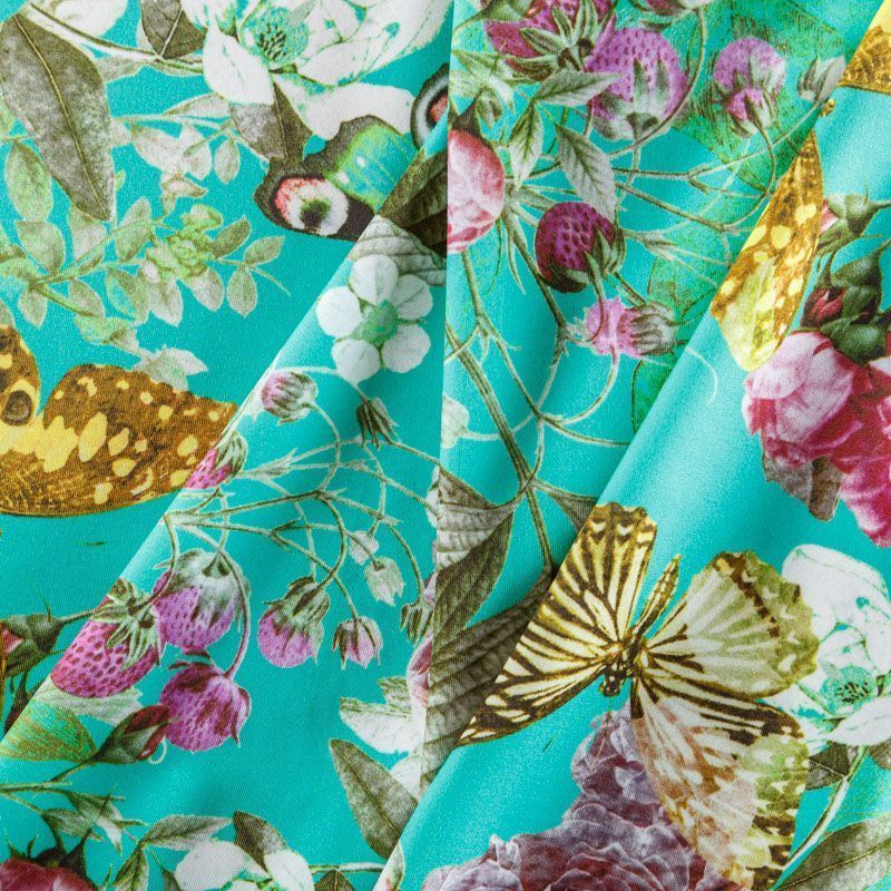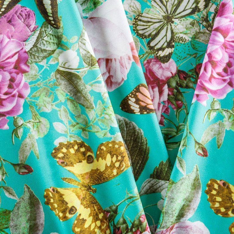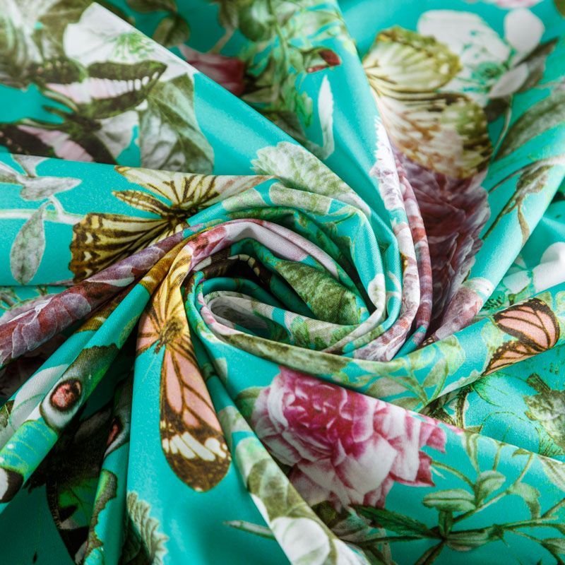 Итальяская качественная, красивая и приятная на ощупь лайкра холодного зеленого оттенка в летним цветочным принтом. Поверхность ткани матовая и гладкая. Идеально облегает фигуру, тянется по двум направлениям, хорошо драпируется, отлично держит форму, устойчива к пилингу, долговечна и гигроскопична. Используется для пошива одежды для танцев, гимнастики, фигурного катания, для велоспорта, легкой атлетики и аэробики, фитнеса и других видов спорта, для купальников, женского белья, театральных, цирковых и эстрадных костюмов.