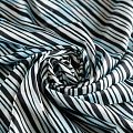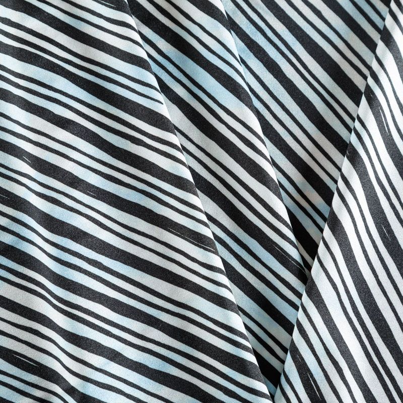 Итальяская качественная, красивая и приятная на ощупь лайкра белого цвета с принтом тай-дай и черной диагональной полоской. Поверхность ткани матовая и гладкая. Идеально облегает фигуру, тянется по двум направлениям, хорошо драпируется, отлично держит форму, устойчива к пилингу, долговечна и гигроскопична. Используется для пошива одежды для танцев, гимнастики, фигурного катания, для велоспорта, легкой атлетики и аэробики, фитнеса и других видов спорта, для купальников, женского белья, театральных, цирковых и эстрадных костюмов.