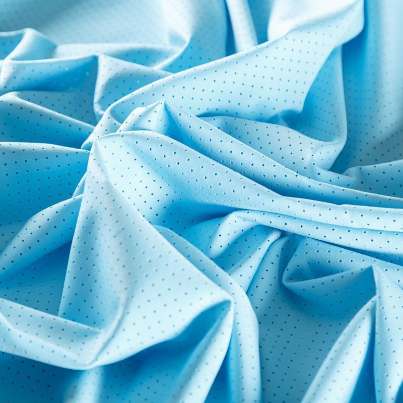 Итальяская качественная, красивая и приятная на ощупь лайкра с перфорацией голубого оттенка. Поверхность ткани матовая, гладкая, шелковистая на ощупь. Идеально облегает фигуру, тянется по двум направлениям, хорошо драпируется, отлично держит форму, устойчива к пилингу, долговечна и гигроскопична. Используется для пошива одежды для танцев, гимнастики, фигурного катания, для велоспорта, легкой атлетики и аэробики, фитнеса и других видов спорта, для купальников, женского белья, театральных, цирковых и эстрадных костюмов.
