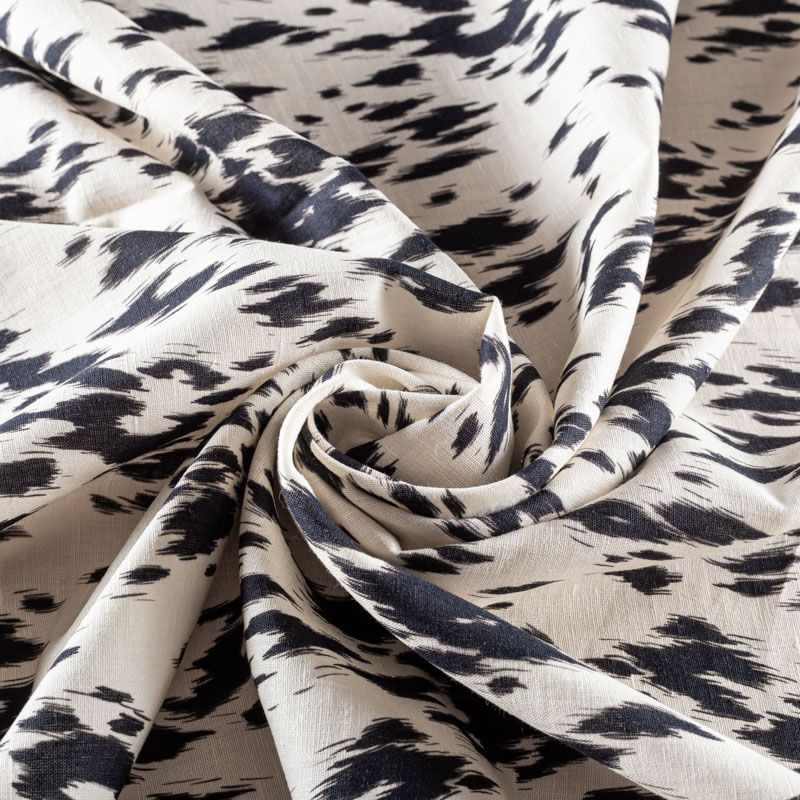 Итальянский костюмно-плательный лен с абстрактным принтом на молочно-бежевом фоне. Ткань прочная, имеет матовую рельефную поверхность и полотняное переплетение, отлично держит форму, пластичная, комфортная в изделии. Отлично подойдет для пошива для летних костюмов, рубашек, туник, платьев, сарафанов, юбок, жакетов, брюк или шорт.