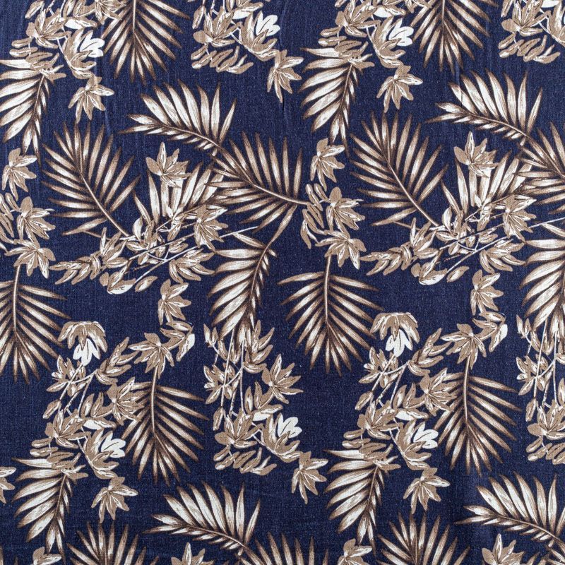 Льняная плательная ткань с добавлением вискозы темно-синего оттенка с растительным принтом. Материал прочный, с выразительной матовой рельефной поверхностью, полотняным плетением, хорошо держит форму, мягкий на ощупь, пластичный, отлично драпируется. Прекрасно подойдет для пошива летних платьев, сарафанов, юбок, рубашек, брюк и шорт.