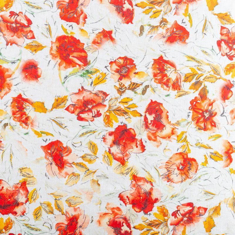 Льняная плательно-рубашечная ткань с добавлением бемерии в белом цвете с акварельными красными маками. Материал прочный, с выразительной матовой рельефной поверхностью, полотняным плетением, хорошо держит форму, мягкий на ощупь, пластичный, отлично драпируется. Прекрасно подойдет для пошива летних платьев, сарафанов, юбок, рубашек, брюк и шорт.