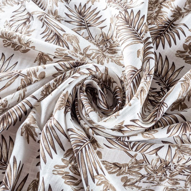 Льняная плательная ткань с добавлением вискозы белого цвета с монохромным растительным принтом. Материал прочный, с выразительной матовой рельефной поверхностью, полотняным плетением, хорошо держит форму, мягкий на ощупь, пластичный, отлично драпируется. Прекрасно подойдет для пошива летних платьев, сарафанов, юбок, рубашек, брюк и шорт.