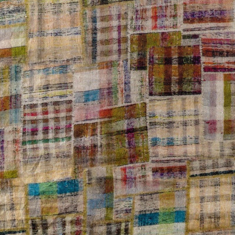 Плательно-рубашечный лен цвета хаки с абстрактным многоцетным принтом. Ткань легкая, средней плотности, поверхность матовая. Приятная на ощупь, хорошо держит форму, немного тянется. Отличный вариант для летних  платьев, сарафанов, рубашек, брюк или шорт.