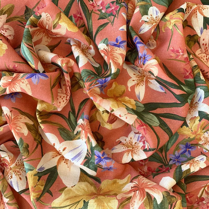 Прочный, выразительная матовая рельефная поверхность, полотняное переплетение, хорошо держит форму, мягкий на ощупь, пластичный, отлично драпируется, тянется. Прекрасно подойдет для пошива летних платьев, сарафанов, юбок, рубашек, брюк и шорт. Льняная плательная ткань с изображением  соцветий ярких лилий на благородном коралловом фоне.